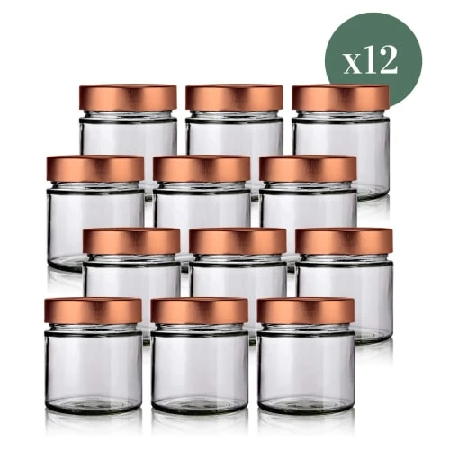 Lot de 12 pots modernes Muscadin 212ml, en verre recyclé, fabriqués en Europe, avec leurs couvercles cuivres